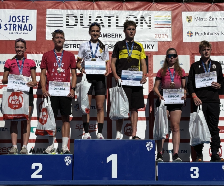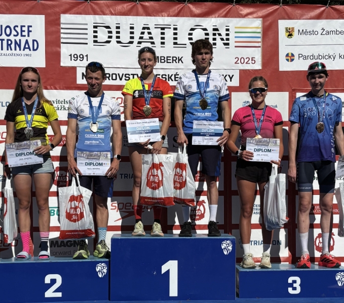 A s domácí sezonou se triatlonisté už tradičně rozloučili v Žamberku, kde se v sobotu 20. září konalo mistrovství republiky v duatlonu. V krásném žamberském zámeckém parku panovalo nezvykle teplé počasí, které atakovalo hranici třiceti stupňů. A v tomto nezvykle teplém počasí se radovali z titulů Robert Němec a Edita Pozlerová. Ale ani triatlonisté z Třebíče nevyšli naprázdno. Medaile za mistrovský závod na tratích 5 - 20 -3 km /běh-kolo-běh/ si odvezly dorostenky Nikola Vodová, která se stala vícemistryní ČR v čase 1:11,26 h následovaná bronzovou Elenou Moudrou /1:12,43 h/. Mezi dorostenci doběhl na 8.místě Jan Auf v čase 1:04,05 h a Martin Kalda na 8.místě za 1:08,21 h. Mezi juniorkami proběhla cílem na 3. místě Lucie Mitisková v čase 1:08,56 h. Junioři Daniel Oborný a Václav Vostal doběhli na 7.resp.10. místě v časech 1:00,04 h a 1:05,56 h. V nabité kat. mužů 50-59 let se na 6.místě umístil Stanislav Mitiska časem 1:05,27 h a 22. místo obsadil Milan Procházka za 1:17,53 h.